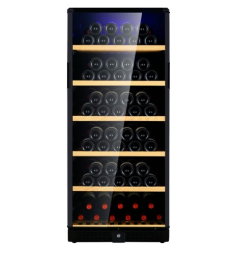 | Features | Single temperature zone Adjustable temperature: 5~18 C LED interior light and temperature display UV insulated double glass door Low emissivity coating Black body with black frame glass door 5 full size wooden shelves (telescopic) Ventilation circulatory system Reversible door Lockable Refrigerant: R600a |
